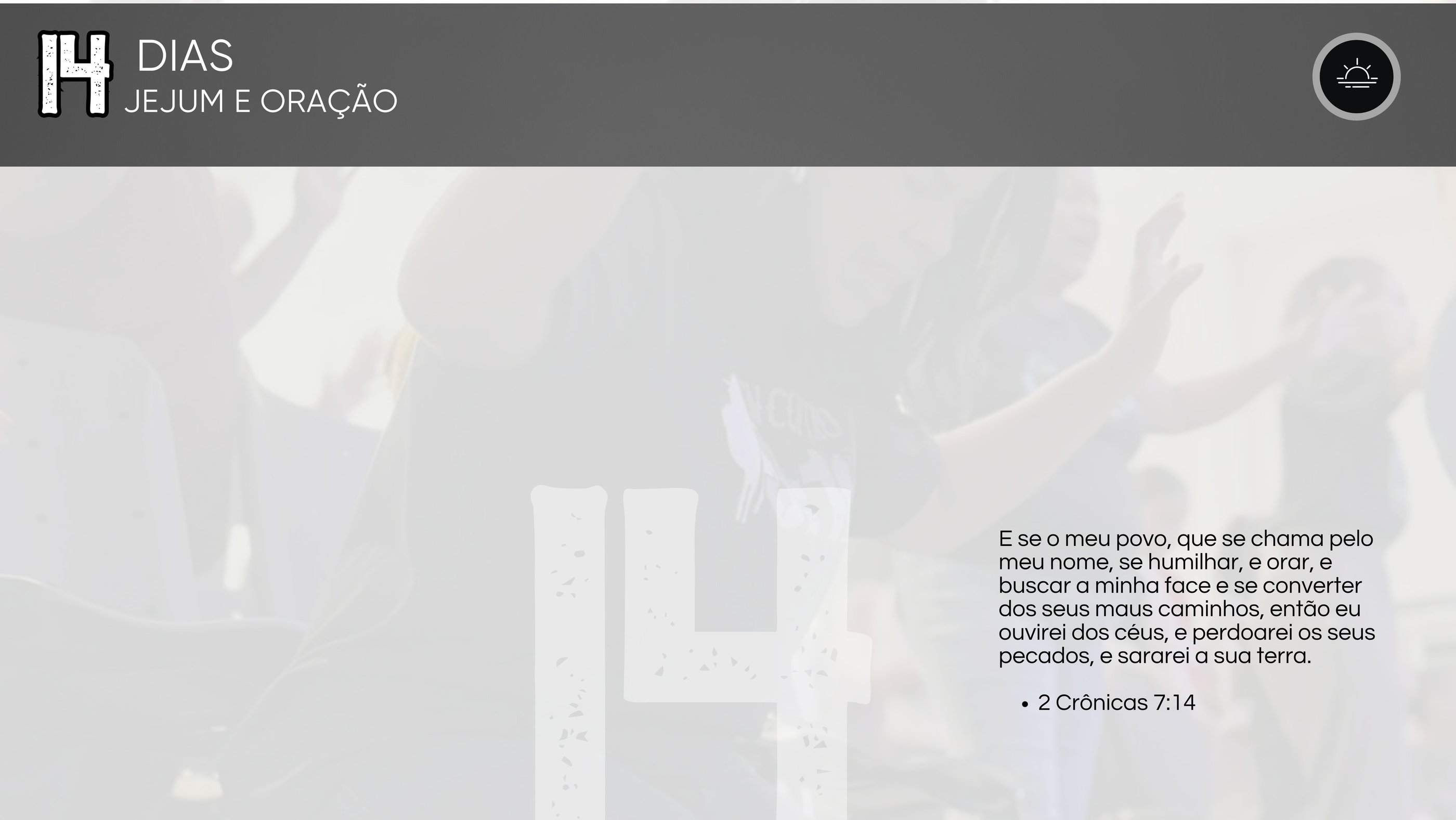 14 dias de jejum e oração, será o nosso compromisso mais importante nos próximos dias. Entre os dias 16 de março a 29 de março, estaremos juntos buscando avivamento e poder de Deus não só para atravessar a crise, mas para continuar realizando o propósito e a visão que Ele nos deu. Por isso prepare-se, serão dias intensos, inesquecíveis e transformadores.